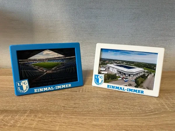 Der Rahmen ist perfekt geeignet für Fotos im Querformat (10 x 15 cm) – ideal für Stadionerinnerungen, FCM-Momente oder Vereinsfotos.