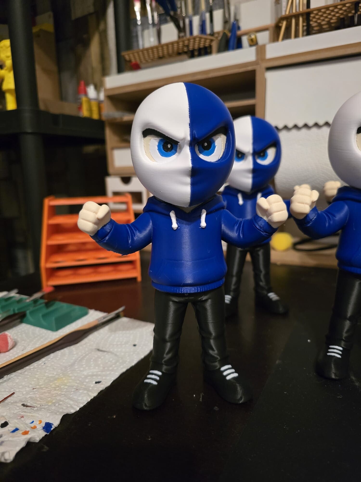 Mit ihrer geteilten Maske in Blau und Weiß, den ausdrucksstarken Augen und der kämpferischen Pose (geballte Fäuste!) verkörpert sie Stärke, Zusammenhalt und Charakter. Der sportliche Hoodie, die schwarzen Hosen und die markanten Sneaker runden das moderne Street-Design perfekt ab.